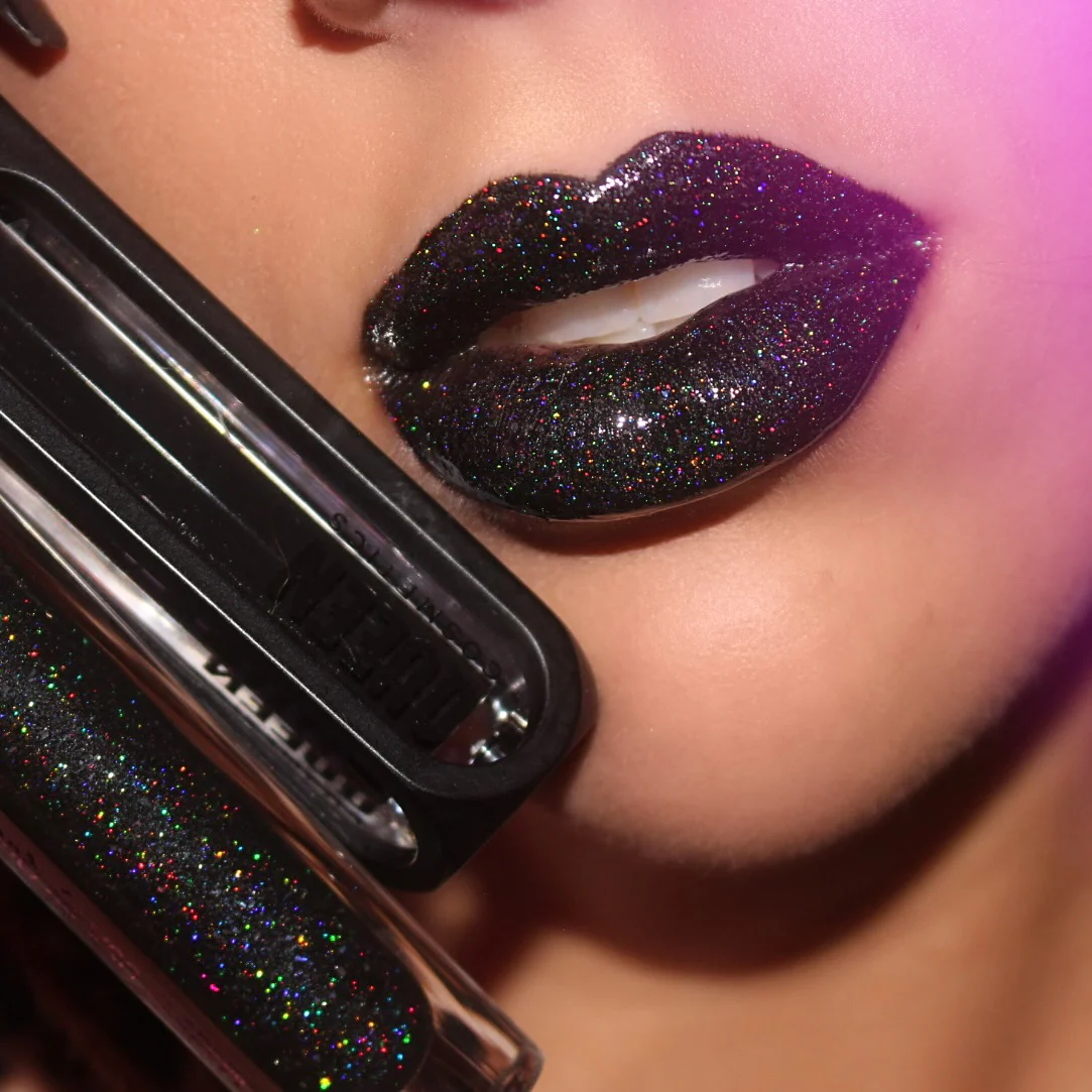 Black Widow Holographic Gloss – a mesmerizing black gloss infused with holographic shimmer, casting a kaleidoscopic brilliance that shifts with every angle.